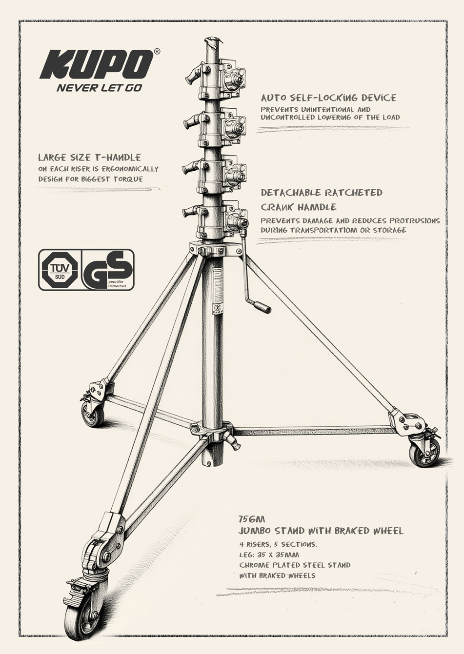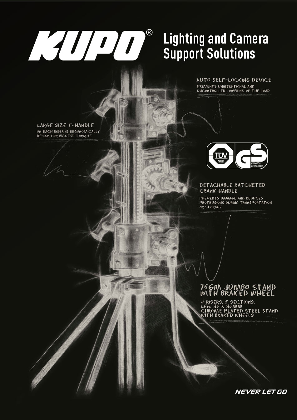 影视事业部成立以来,KUPO积极开拓,打造卓越品质并取得多项国际专利产品,在全球范围内受到专业人士的热爱,这些产品包括:可分离式C-Stand魔术腿、快拆连锁脚架、带自动防回装置的手摇脚、L型锁紧和释放把手设计、聪明臂防滑牙盘、快速伸缩吊杆等。KUPO多款产品通过了德国TUV-GS、欧盟CE、美国UL、加拿大CUL等多项国际安全认证,在全球化竞争中,树立品质第一观念,提供坚固耐用的产品——我们坚信唯有长久卓越的极致表现,KUPO才能与您一起源源不断地写进当下波澜壮阔的发展历史。