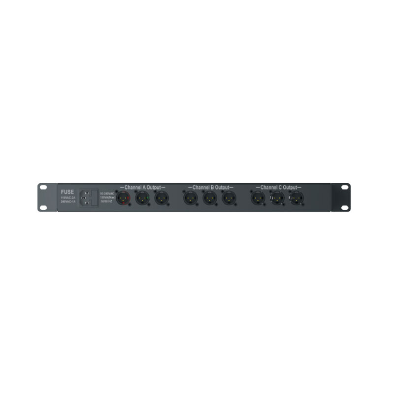 KUPO Goreal内通主机采用坚固的铝合金外壳,输入电源支持全球电压(AC 90V~240V)。设备设有三通道,A/B/C通道可独立或合并通话,每个通道可连接20个通讯腰包,三个通道共可连接60个通讯腰包。主机内置电源指示灯,配备IEC电源线,兼容Clear-com有线内通系统。